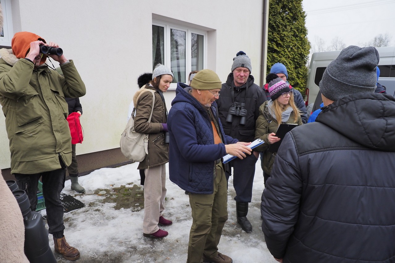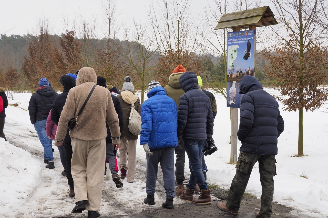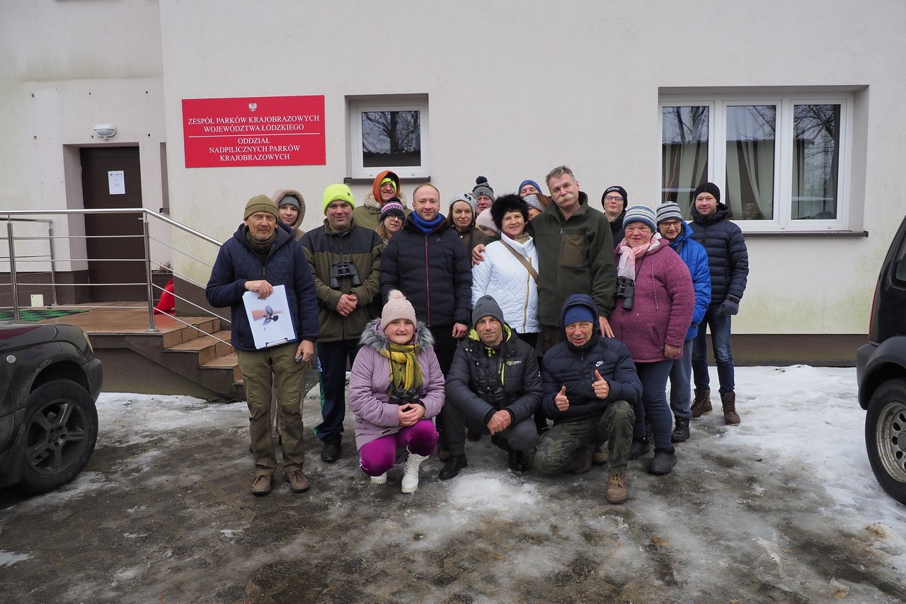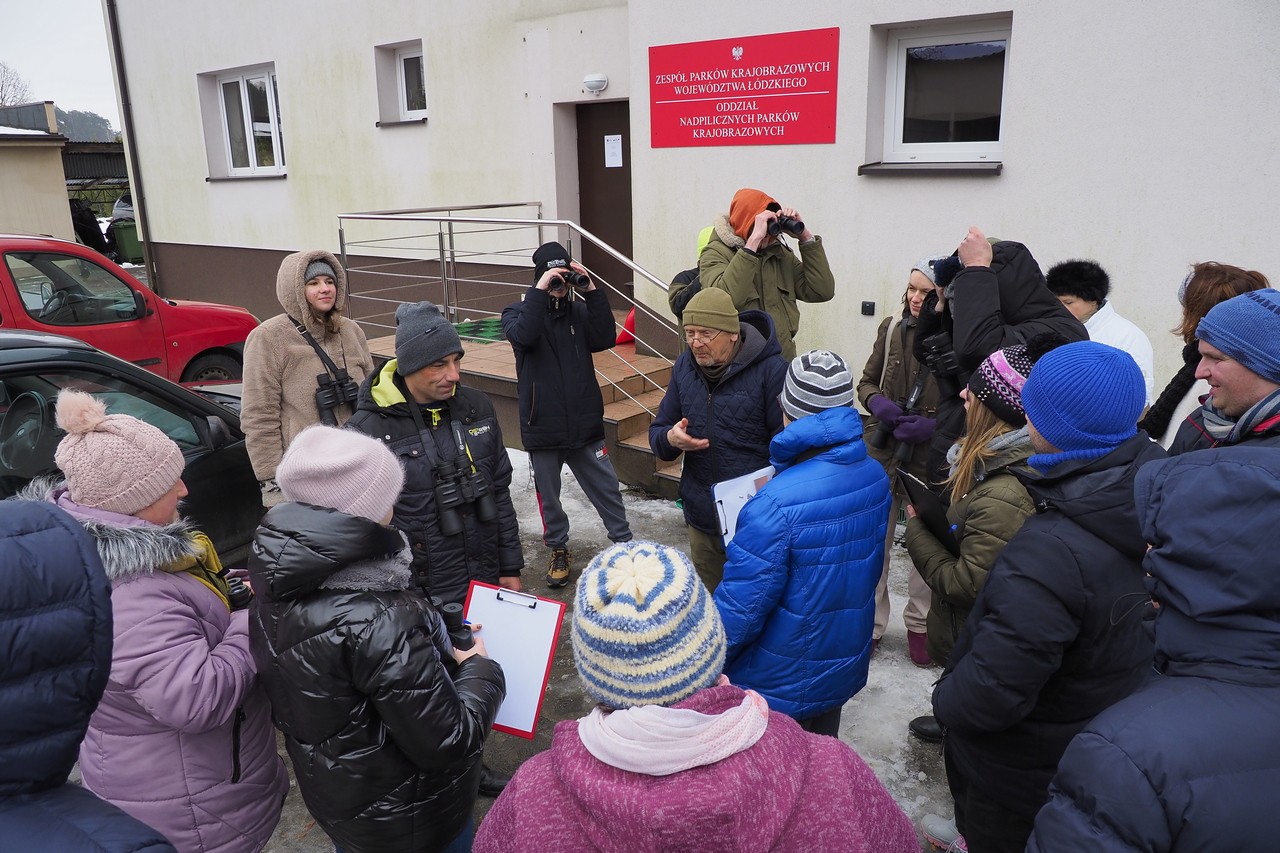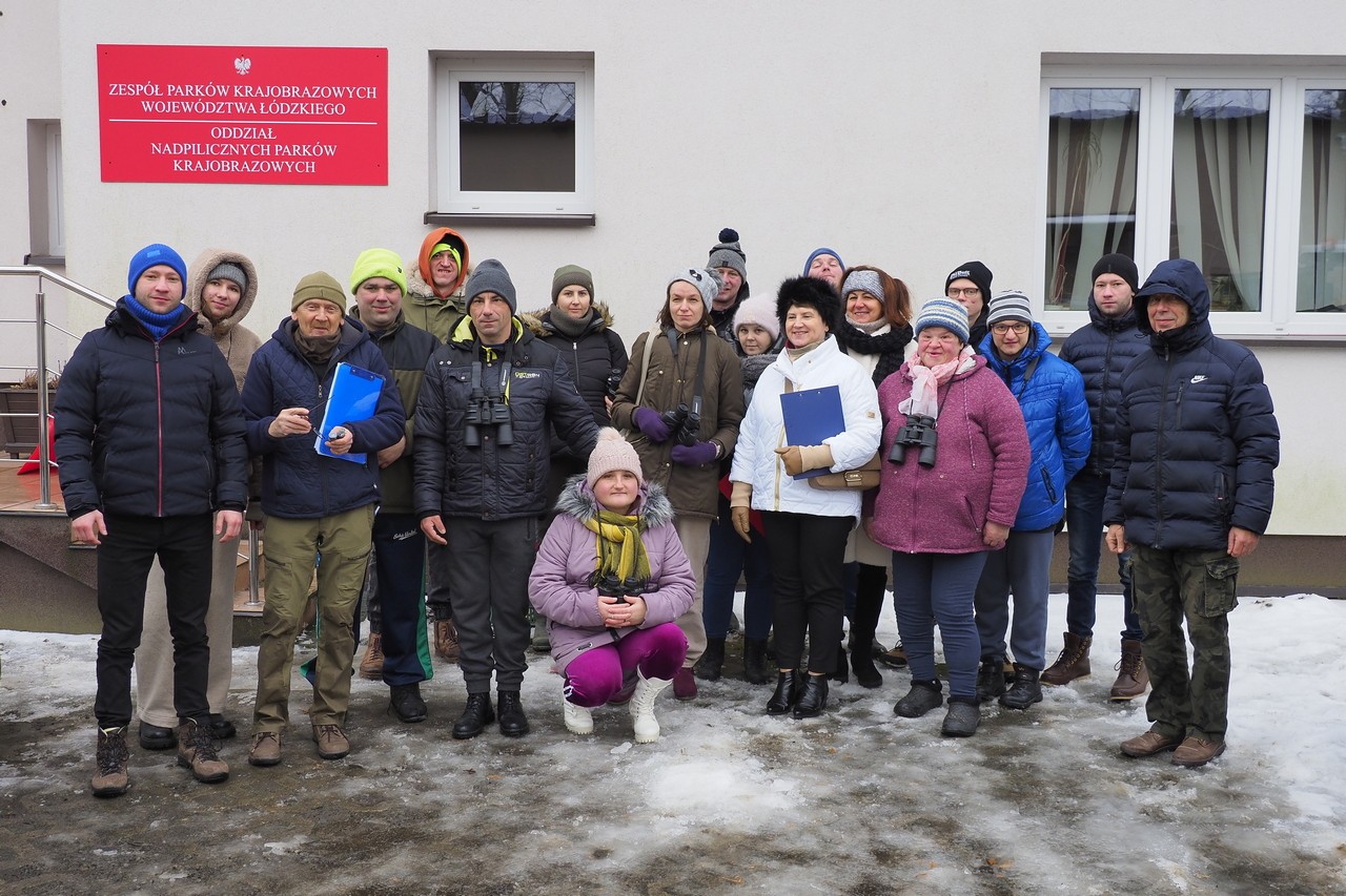 Ptasia Godzinka jest przeznaczona dla wszystkich osób zainteresowanych przyrodą i ptakami w swoim otoczeniu. Wziąć w niej udział może absolutnie każdy – nawet bez wcześniejszego doświadczenia w liczeniu ptaków". W dniu 16.01.2026 r. w siedzibie Sulejowskiego i Spalskiego PK w Moszczenicy gościliśmy grupę 20 osób z Warsztatów Terapii Zajęciowej "Kubusie" z Moszczenicy. Grupa - z opiekunami i naszymi pracownikami z ZPKWŁ brała czynny udział w "Ptasiej Godzince". Pogoda dopisała, było zimowo, leżał śnieg i panował niewielki mróz. Centralnym miejscem obserwacji ptaków były trzy karmniki w naszej siedzibie pełne ptasich smakołyków - różne nasiona, słonina, jabłka. Uczestnicy wycieczki zostali wyposażeni w lornetki, przewodniki terenowe oraz zdjęcia ptaków udostępnione przez organizatorów. Ponieważ ptaki są dokarmiane już od listopada - to przy karmnikach pojawili się stali bywalcy: bogatki 15 szt., modraszki 10 szt., sójki 4 szt., kowalik, rudzik, mazurek, kos. Nieregularnie przy karmniku pojawiają się dzwońce i czyże. Nasi przewodnicy opisywali charakterystyczne cechy po których można rozpoznać poszczególne gatunki i ich płeć. Po godzinnej stacjonarnej obserwacji, grupa udała się na spacer do lasu i tereny otwarte łąkowe. W tym środowisku udało nam się zobaczyć: krogulca, czaple siwą, tokujące kruki.